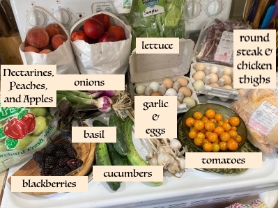 This week, in an attempt to gain control over time (bwahahahaha), the Farmers’ Market visit took place as soon as possible – so the early arrival at 0710 was pretty impressive. There were still quite a few people there, but the lines were not so oppressive as the temps were low. This week, the goal was to find out how much a bushel of tomatoes might be (and no, $3.50/lb for a bushel is not a realistic option), to get a slew of seconds peaches, see what apples might be around, and check the Special Deal at Moore Family homes in an attempt to stock up the freezer. Of those goals, one was met. More on that later. Visit summary first: